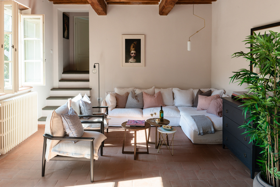 A recently-restored gem not far from Lucca, with heaps of historic charm, contemporary interiors and a private saltwater swimming pool. It sleeps 7 + 1. Views of the garden, olive groves and the Tuscan hills are visible from every window, while outside opens up different spaces for eating, sitting and relaxing, offering sun and shade alike. Parents will love the walled garden at the back of the house, where you can escape from the kitchen with a coffee or a glass of wine. Prepare family meals on the BBQ and enjoy alfresco dining under the pergola, or simply relax under the shade of a centuries-old oak tree and around pool, looking out to the wooded hills beyond.