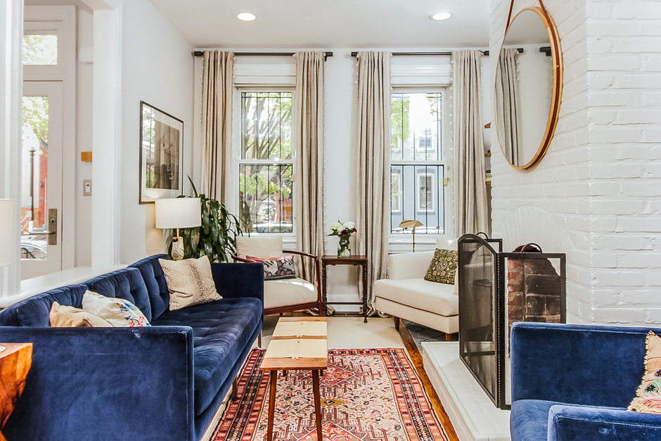 Charming 19th century townhouse. This historic home is warm, light-filled and airy, featuring an eclectic but inviting mix of furniture and art with a light-colored palette throughout. The upstairs and downstairs mix vintage Turkish rugs with mid-century furniture and art from the family's travels, while 3 skylights on the upper floor and transom windows provide natural light during the day for the office, hallway, bedrooms and upstairs bathroom. We love the exposed brick wall fireplace in the living room, the luxurious contemporary tiling in the bathroom and the beautiful triple windows in the primary bedroom.