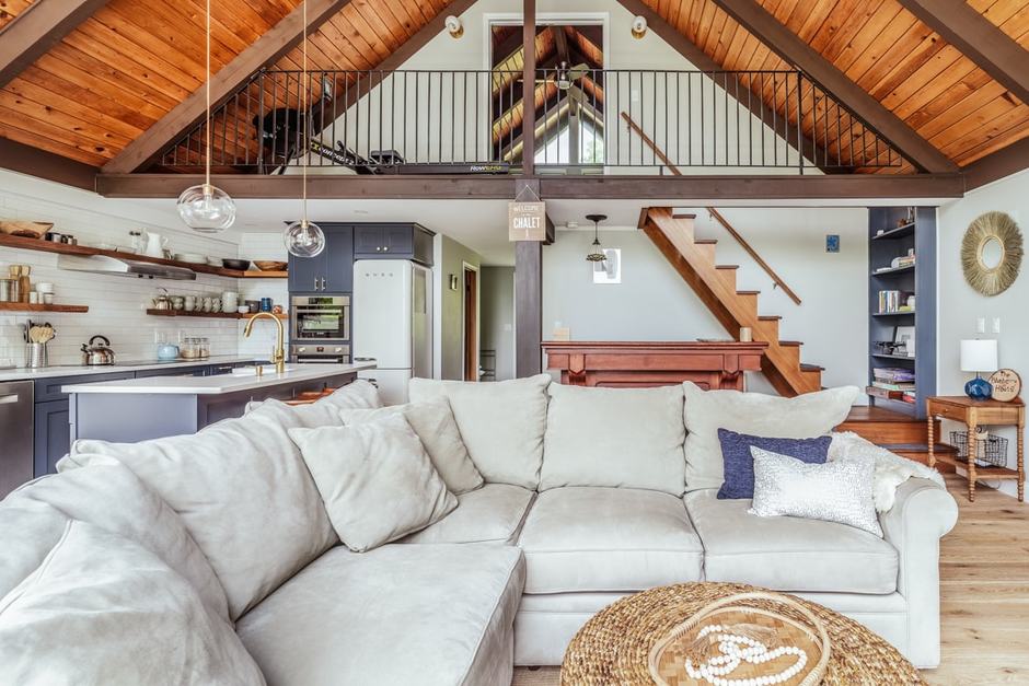 Chic cabin. This light-filled A-frame house is cozy yet contemporary, with a striking dark blue hue used throughout the property - the hosts have nicknamed it the Blueberry House! Dramatic views provide the perfect backdrop for this modern family home, with warm natural wood textures used throughout to create a rustic, laid-back feel. We love the striking A-frame windows, the cozy yet contemporary wood-burner and the colorful wall hangings which add a natural, bohemian touch.