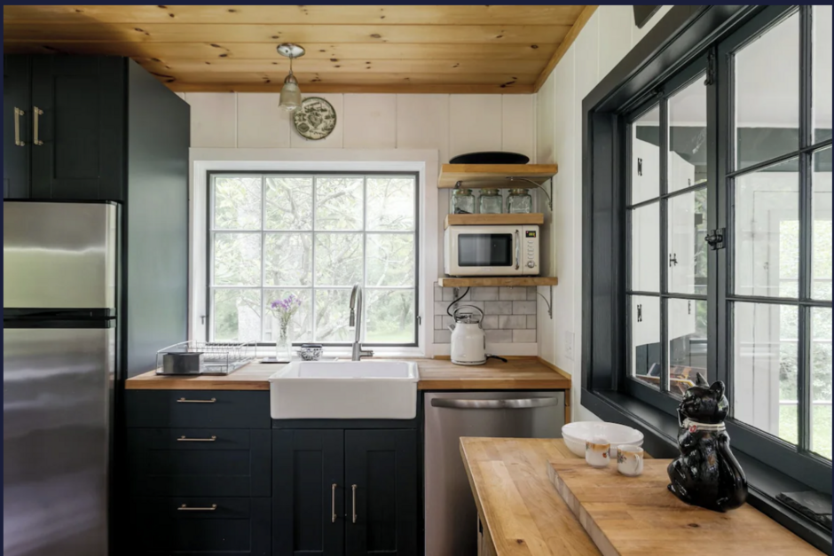 Cozy Cottage. The cottage aesthetic is warm, welcoming and rustic, while boasting sophisticated decor chosen by the hosts. The building maintains its exposed wood paneling walls and ceilings, creating a cozy cottage atmosphere, updated with contemporary-style large windows and a modern kitchen. We love the exposed rustic wall in the kitchen, the large brick fireplace and the chic neutral bathrooms.