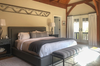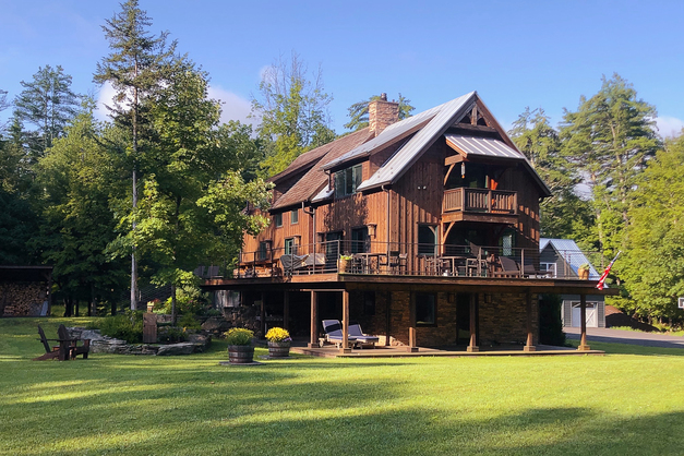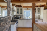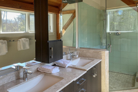 Woodstock wonder. Bright and light, the house boasts large windows to enjoy the scenery and wildlife, with sophisticated and stylish interiors. With a post-and-beam design, the home has high ceilings and an eye-catching floor-to-ceiling stone fireplace. The whole family will love the large comfortable sofa and large screen TV to watch movies, and there’s an additional TV located in one of the guest bedrooms. We love all the exposed wooden beams creating a rustic, laid-back feel, as well as the tree frame balcony and the stylish pendants over the island.