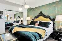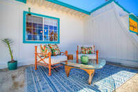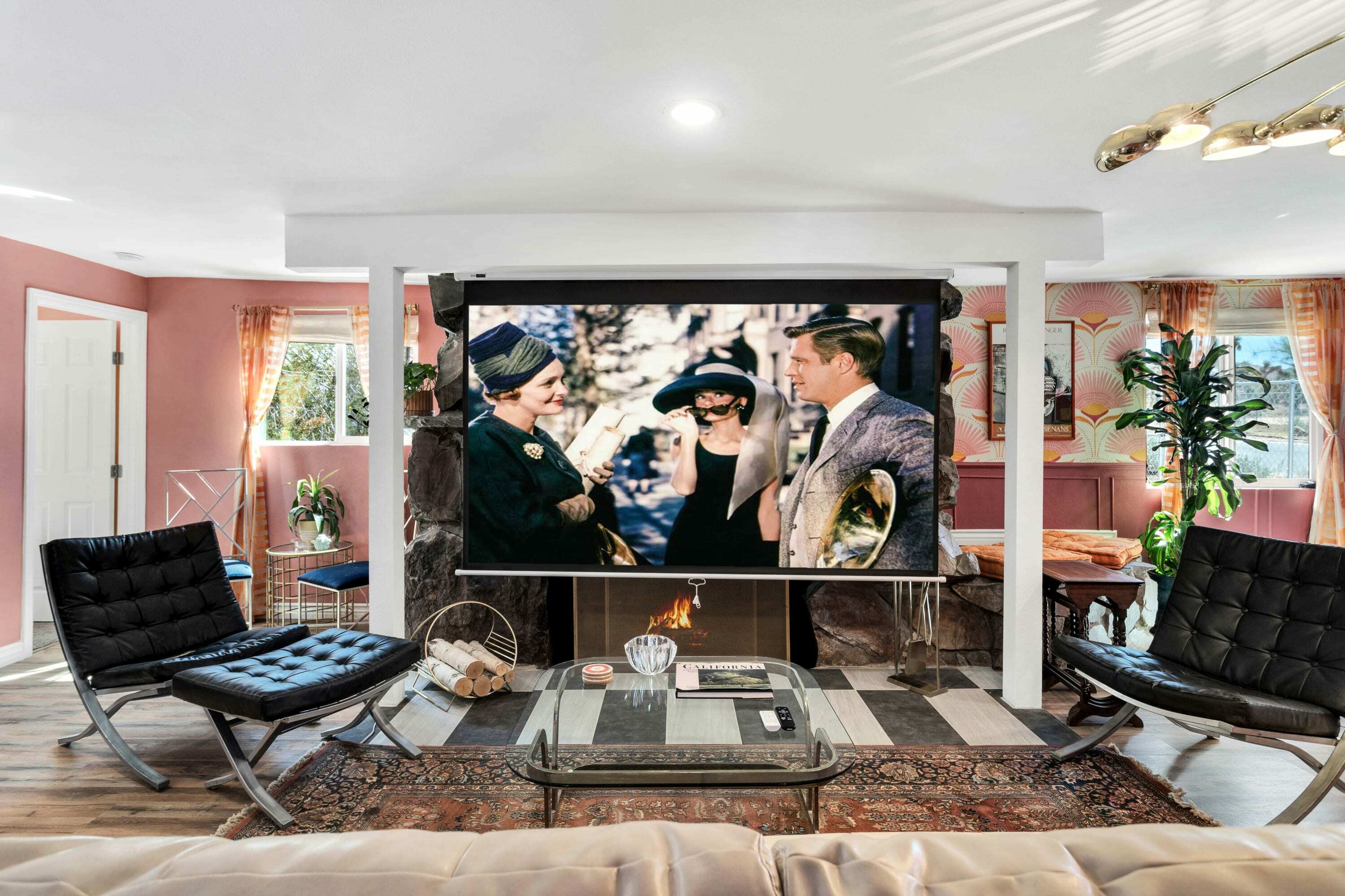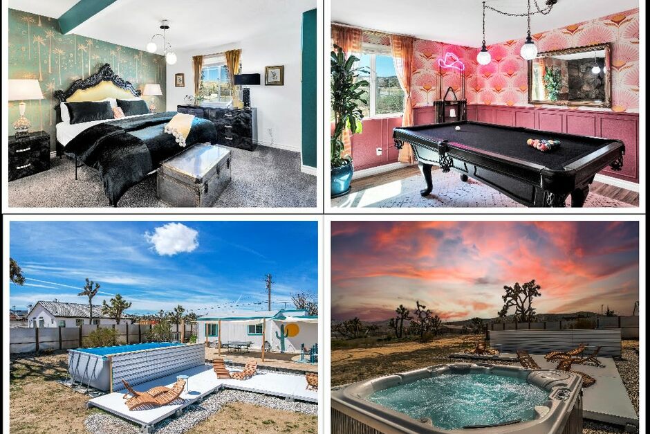 An artistically designed desert retreat set amongst glorious mountain scenery, with the Joshua Tree national park and amenities of Yucca Valley on the door step. It sleeps 8. Styled by a film production designer, every space in this home feels like it’s part of a movie set with bright colors, handpicked art and furnishings, and creative curation throughout. With plenty of indoor space and a fully enclosed outdoor yard full of games, parents can relax knowing the kids are contained as well as entertained. The outdoor yard is thoughtfully landscaped with lots of shady nooks designed for enjoying a quiet moment, including a meditation tent, a hammock paddock and sun loungers galore. The large saltwater pool is the perfect place to cool off at hotter times of day, while the newly installed hot tub with LED lighting comes into its own as the sun sets. There’s a feature propane firepit for night time gathering and star gazing, and a poker/card table, as well as a home cinema inside for keeping the entertainment going. Parents can be sure of a restful night with luxurious bedding, stylish ensuite bathrooms and a roomy kingsize bed in the primary bedroom.